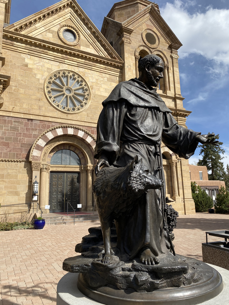 Our final day in New Mexico took us back to Santa Fe. We hit all the sites we missed during our first day. This included the Oldest House in the US (circa 1646), The Oldest Church in the US (circa 1610: closed due to Covid), Loretto Chapel to check out the spiral staircase, and The Cathedral Basilica of St. Francis of Assisi. With these landmarks completed, I noticed a French pastry shop. I had to stop in for a look and maybe a treat. With pastries in hand, we headed to the Plaza and enjoyed them.
