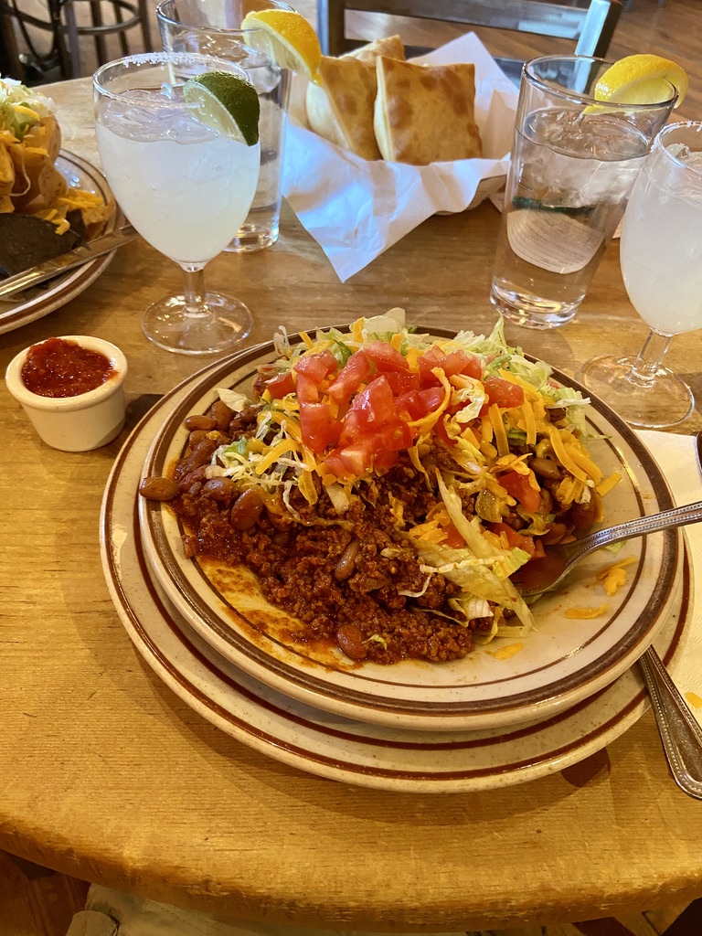 After taking in a few more shops in the downtown square, we headed to the Sierra del Norte Trailhead for a hike. This offered great views of Santa Fe. With our hike completed, there were two more places we wished to visit. We would stop at Maria’s, known for their margaritas, to have a late yet lite lunch: chips & salsa and mini tacos. Although we wanted more, we resisted as we would make our way to La Choza’s for dinner. La Choza is an award-winning Santa Fe favorite. This was evident the minute we pulled into the parking lot as there was a line outside the doors. As it was only the two of us, we were able to get a table fairly quickly. With the typical Southwestern and Mexican-inspired menu, I was ready to order my usual, but then I noticed something I had not seen before, Frito Pie! Frito chips, lean ground beef, red chile, pinto beans, cheese, onions, lettuce, and tomato. Frito Pie it would be. It was love at first sight. It was great, with a crunch you can only get with Fritos. Topping this off, they served sopapilla at the end of your meal, a New Mexican type of fried dough drizzled with honey.