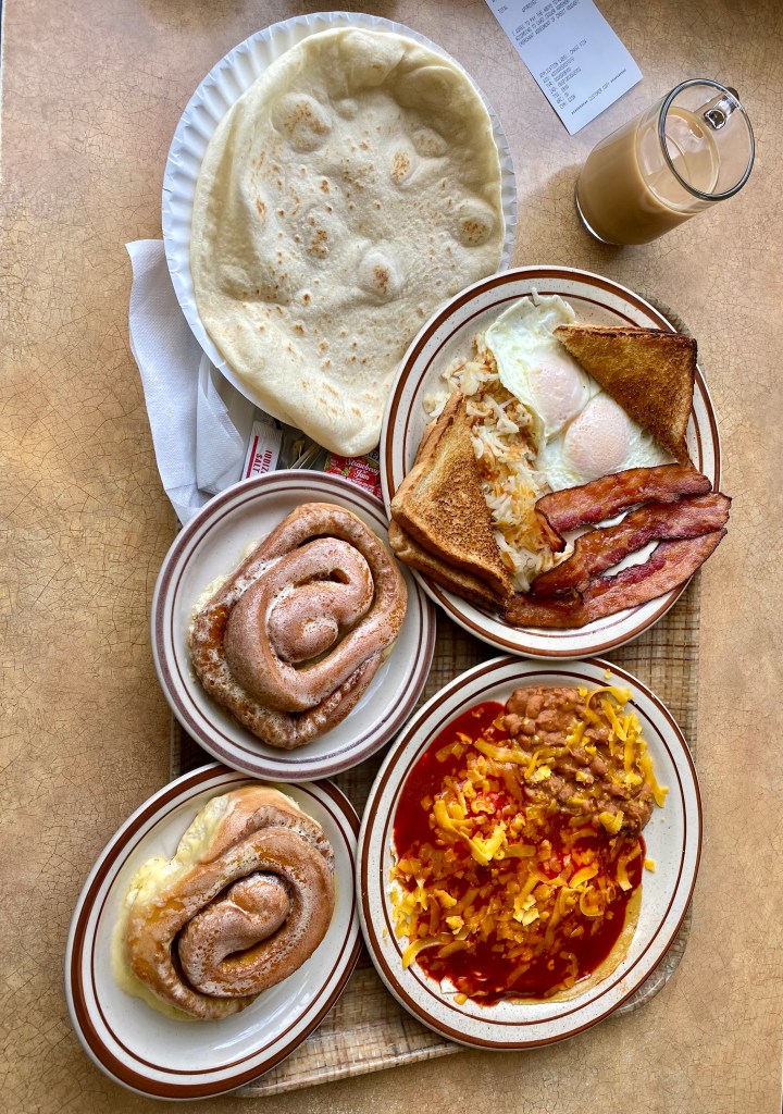 The next day we set off to Albuquerque. With a 4.5-star Goggle rating and a description that reads “Down-to-earth counter-serve restaurant offering homestyle Southwestern fare since 1971,” we headed to Frontier Restaurant for breakfast. After figuring out how to place our order, we took a table and waited for our number to be called. To our order, we added what we thought was a cinnamon roll. In actuality, it was a Frontier sweet roll. We were caught off guard by the taste. It was not what we expected or hoped for based on the reviews we read. You see, we are always in search of the best bagels, cinnamon rolls, and scones. I do not know the difference between a sweet roll and a cinnamon roll, but this did not make our favorite list. The rest of the meal did not disappoint. Check out the portion size in the picture below. I wasn’t leaving hungry! Needing to work off this meal, we headed to Old Town to take a walk.