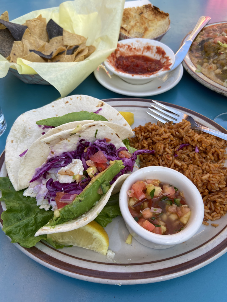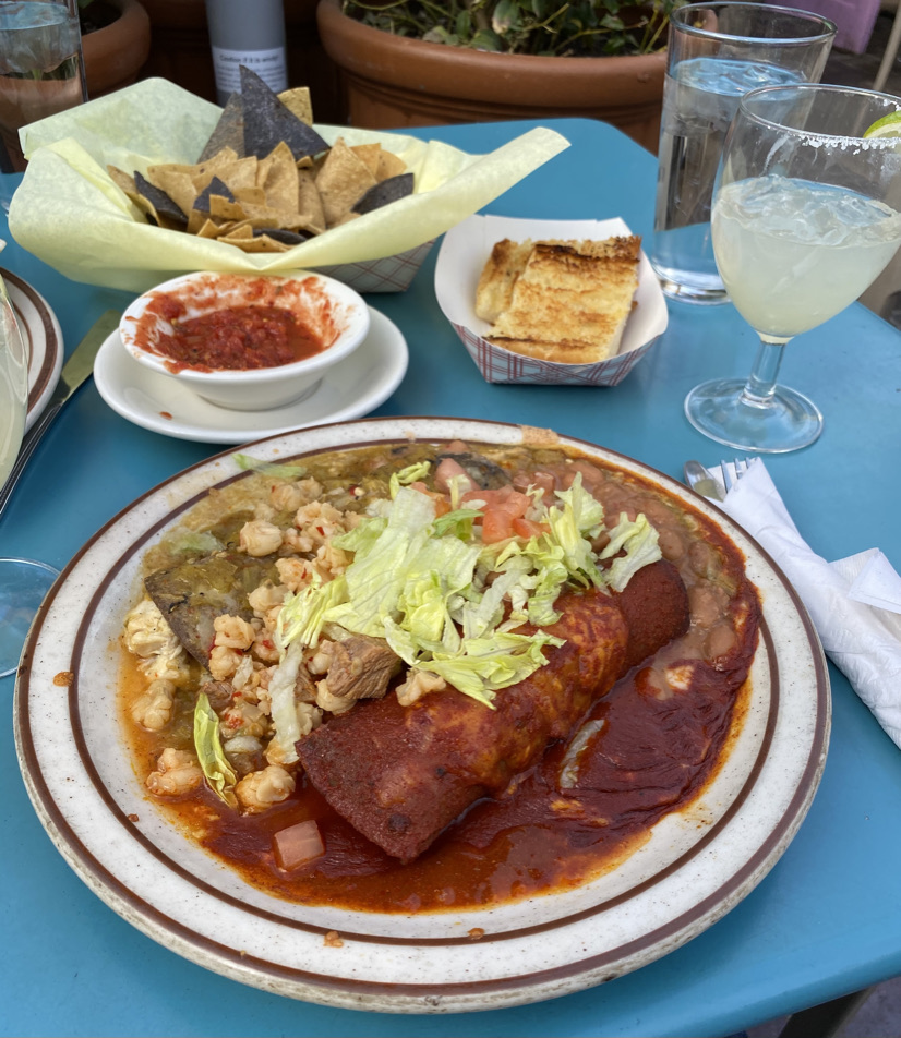 New Mexico takes its cuisine and its chilies very seriously. We were excited as we read through the menu as this would be our first authentic New Mexican meal. For me, I had to order what I consider the holy trinity of any Mexican-influenced food: chips & salsa, enchiladas, and a margarita. For my wife, an order of fish tacos. Now the tough question, and new to us, I was offered red or green chilies. Be prepared for this when traveling to New Mexico, it is a big thing! To make life easy our waiter suggested one of each known as Christmas. I now could enjoy both without having to choose one or the other. When the food arrived, we paused to admire our plates and then enjoyed our first flavors of New Mexico cuisine. As for the chilies, I loved both. Christmas chili would be my staple for all future meals requiring a chile sauce. I would now sound like a local when ordering. An unusual surprise was the traditional garlic bread served with our meal, which did not go to waste. Everything was excellent! We enjoyed dinner on the outdoor patio, a bonus. This was a perfect way to end our first day in New Mexico.