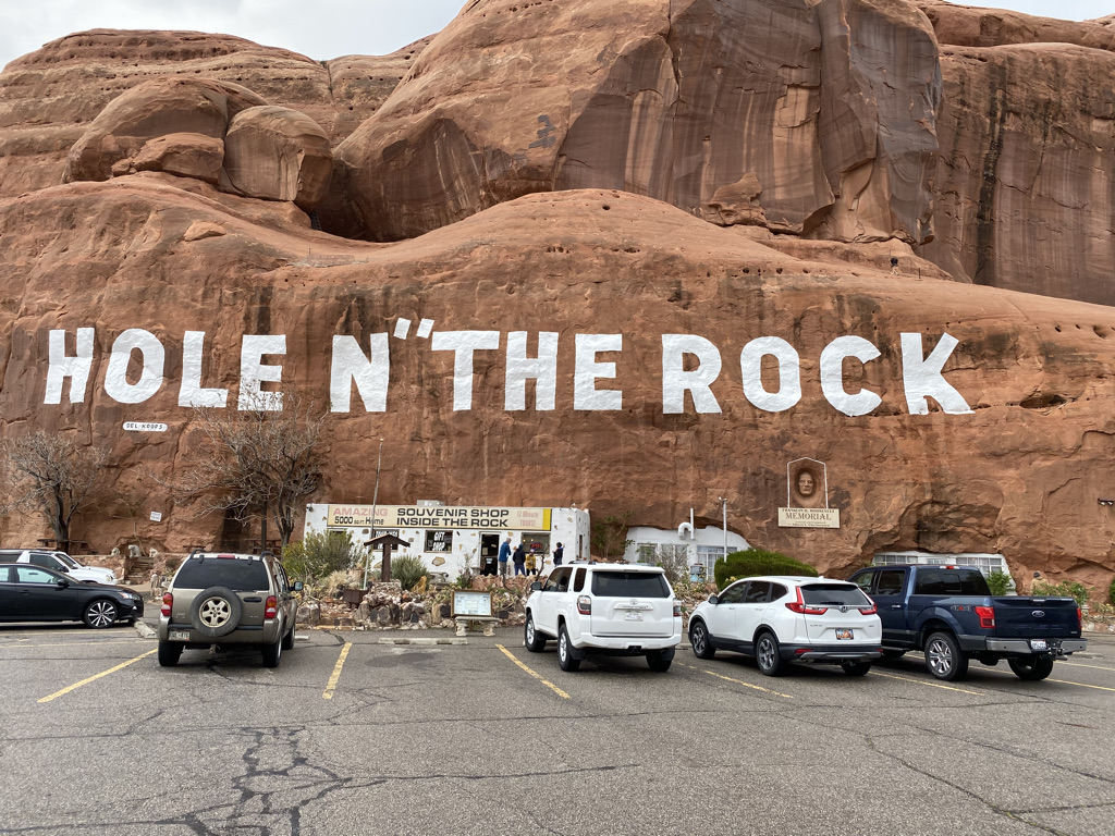 Having spent most of our day in this area, we decided not to visit the Needles Visitor center or drive the La Sal Loop Road. This would give us a reason to return someday. The Utah landscape is amazing, and I would love to spend more time exploring the Needles District. Instead, we decided to head back to Moab, making stops for pictures at Wilson Arch and Hole N’ the Rock, a roadside attraction on 191. We did not take the house tour of the Hole N’ the Rock, but I have included a link if you would like to learn more about this stop.