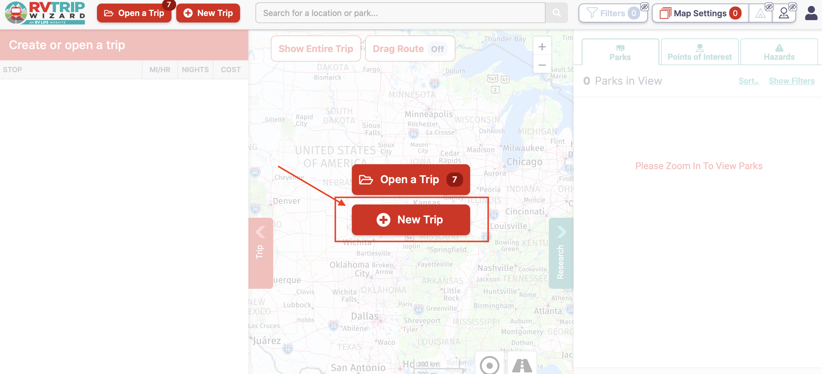 The next time you login into your account the first window to pop up will be a window requesting you to select Open a Trip, one you already created, or create a New Trip.