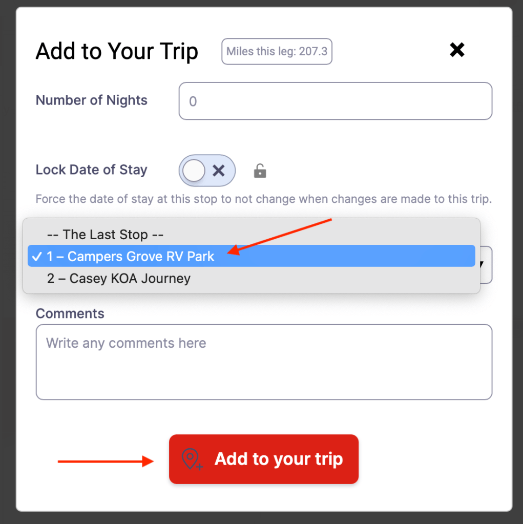 When I do, another window appears. I click the drop-down box under Add This Stop After Campers Grove RV Park. It is then added to my trip stops.