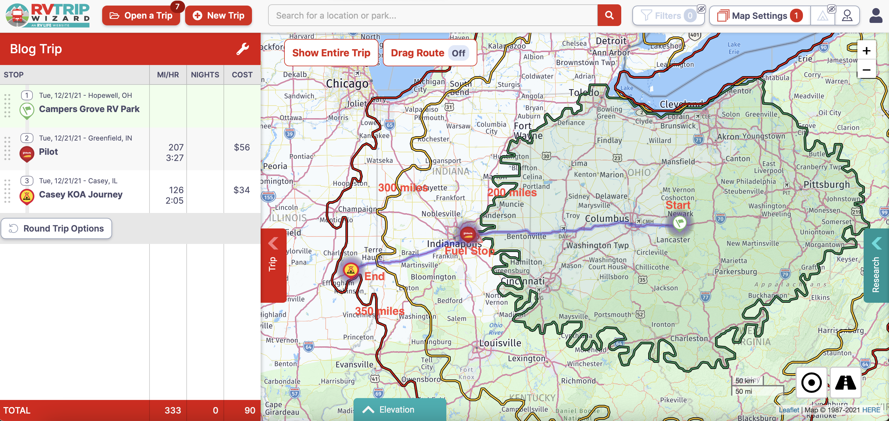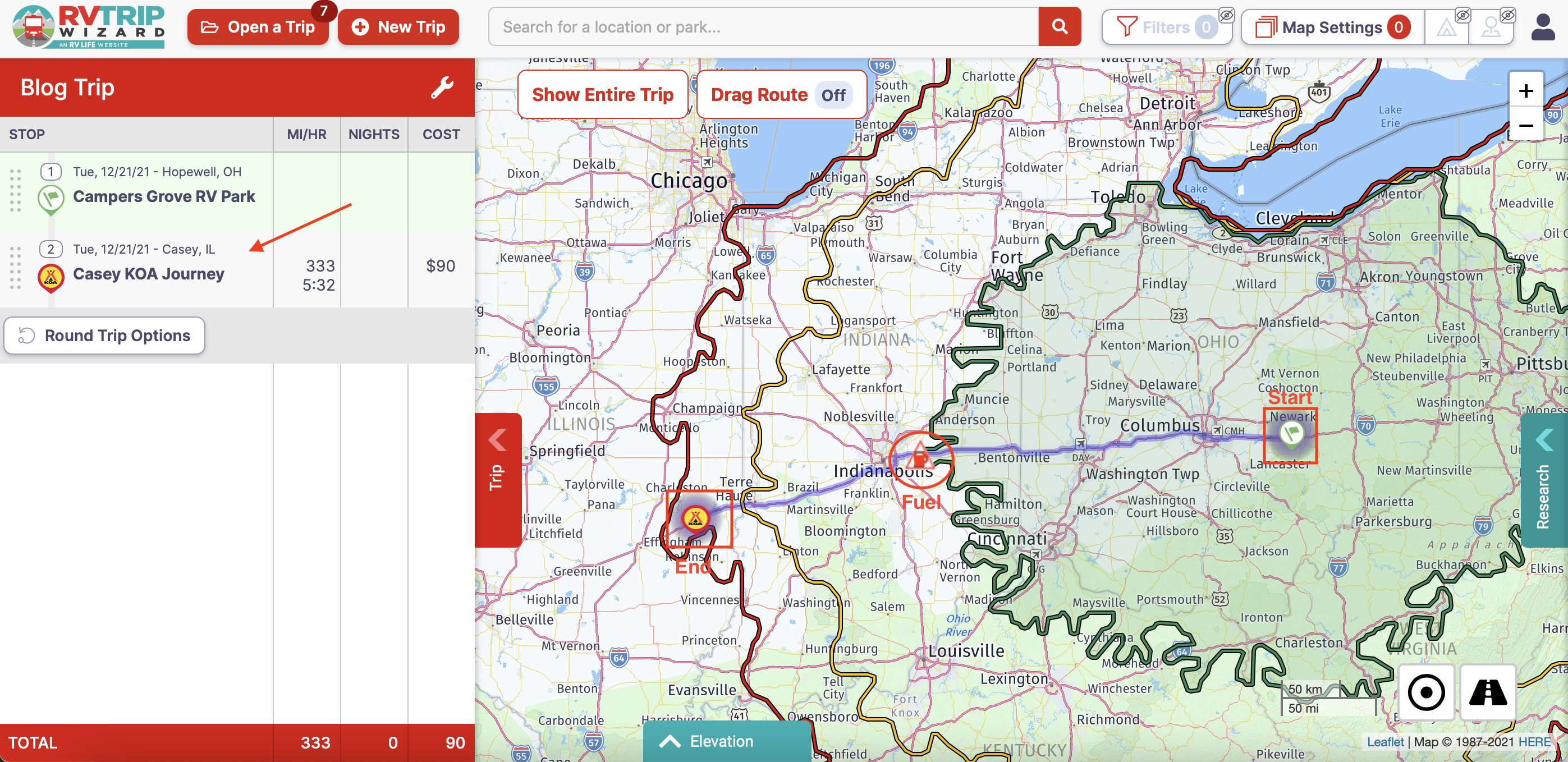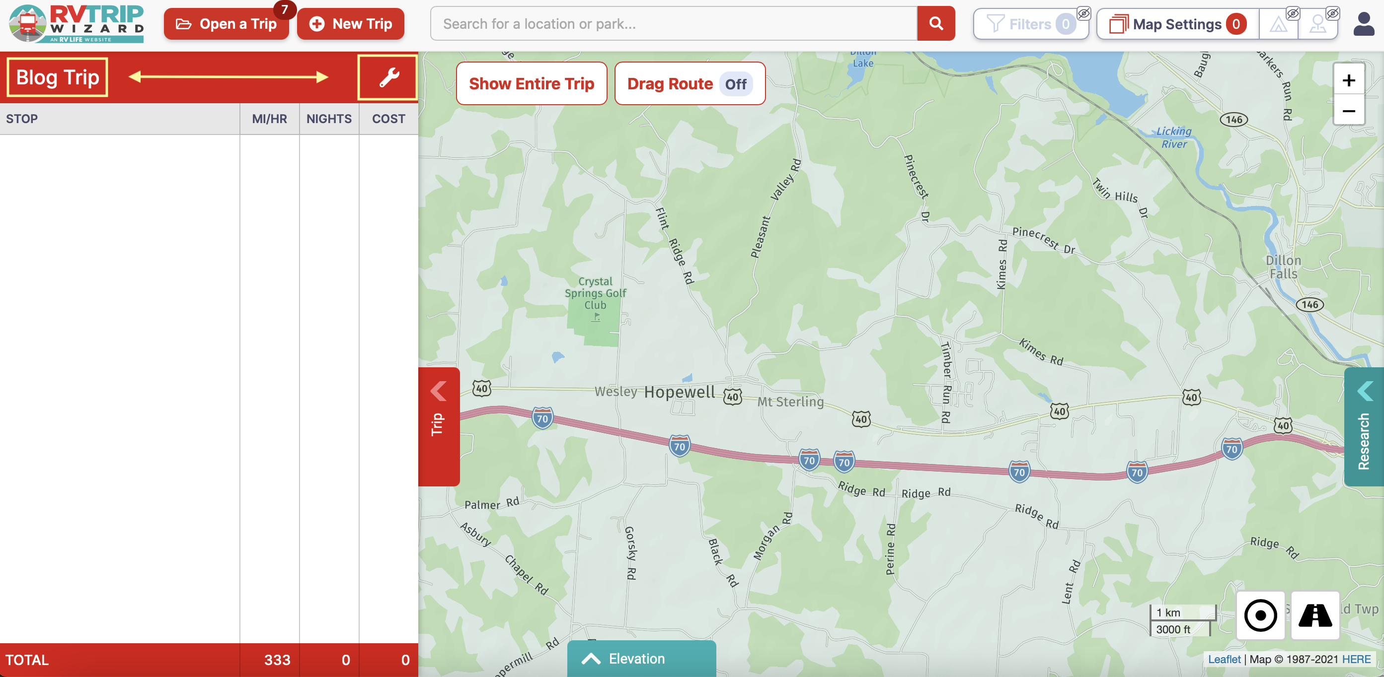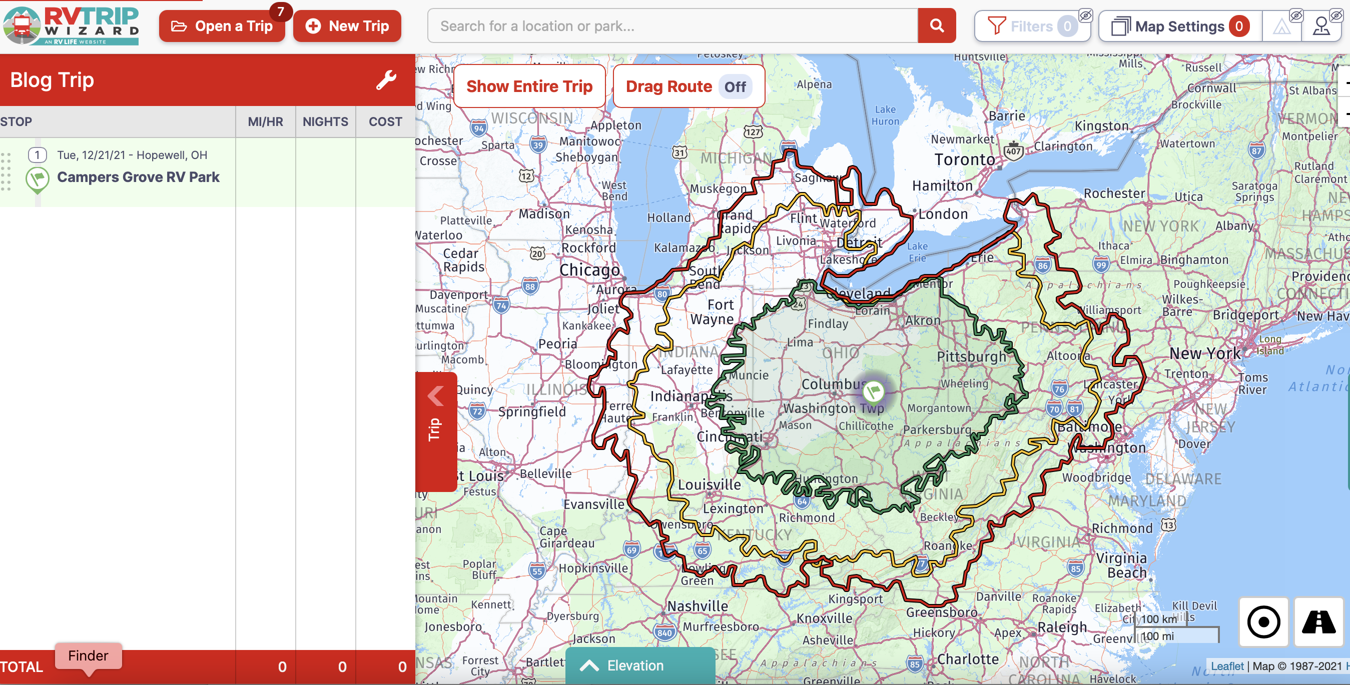In this example I will walk through how I used the software to plan one leg of our trip. I followed the same process for each leg, refining it over time until our route was complete. For this example, I will start at Campers Grove RV Park in Hopewell, OH.