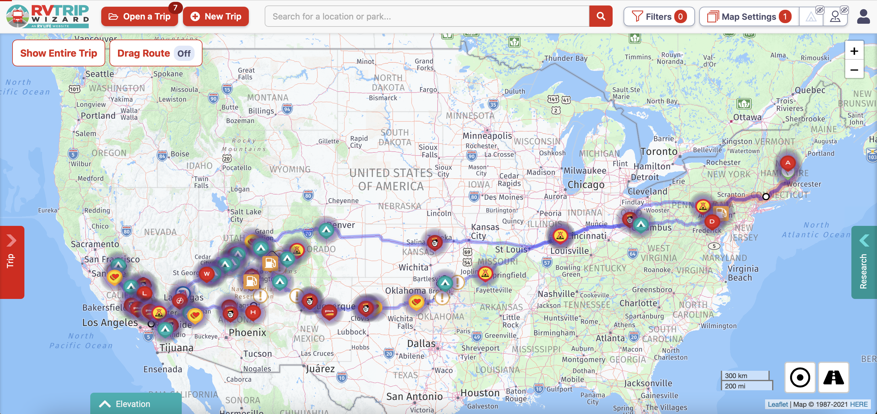 In total, I entered 54 stops, which consisted of 98 nights over three months. Below is my complete RV Trip Wizard trip map.