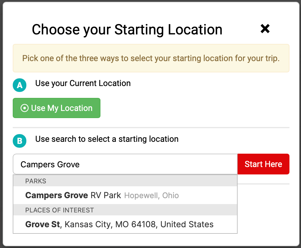 Next, you enter your starting location, several options are provided. I will choose to Use Search to select a starting location and enter Campers Grove in Hopewell, OH. As I begin to type in the location, the software will begin loading locations, from the list I select Campers Grove RV Park Hopewell, Ohio, and then click Start Here. I am now at the main page and can begin planning my next stop.