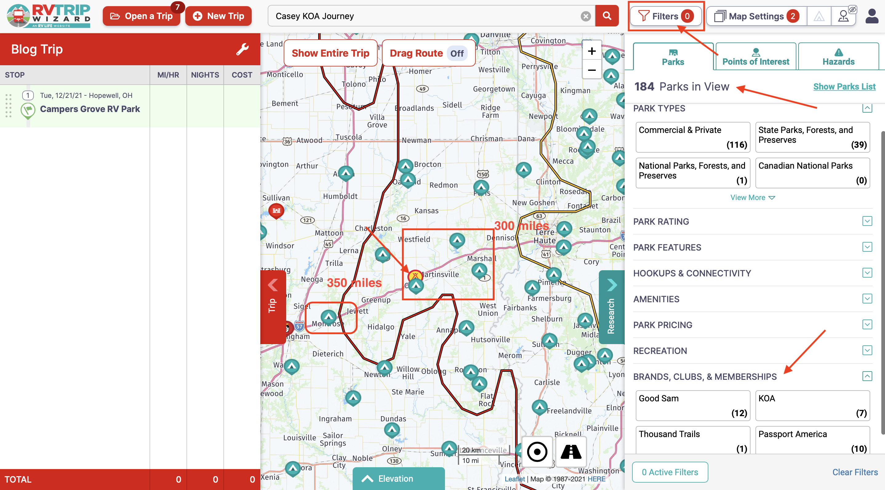 As I zoom in and turn on Filters and Points of Interest (POI). The map displays all the campgrounds in their database, based on the Park Types you select. As I am making my way to Pawhuska, OK, I zoom in on Interstate 70 and focus in on the 300 and 350 mile radius, figuring that is about as far as I would like to drive on this given day. I see five potential campgrounds along my route.
