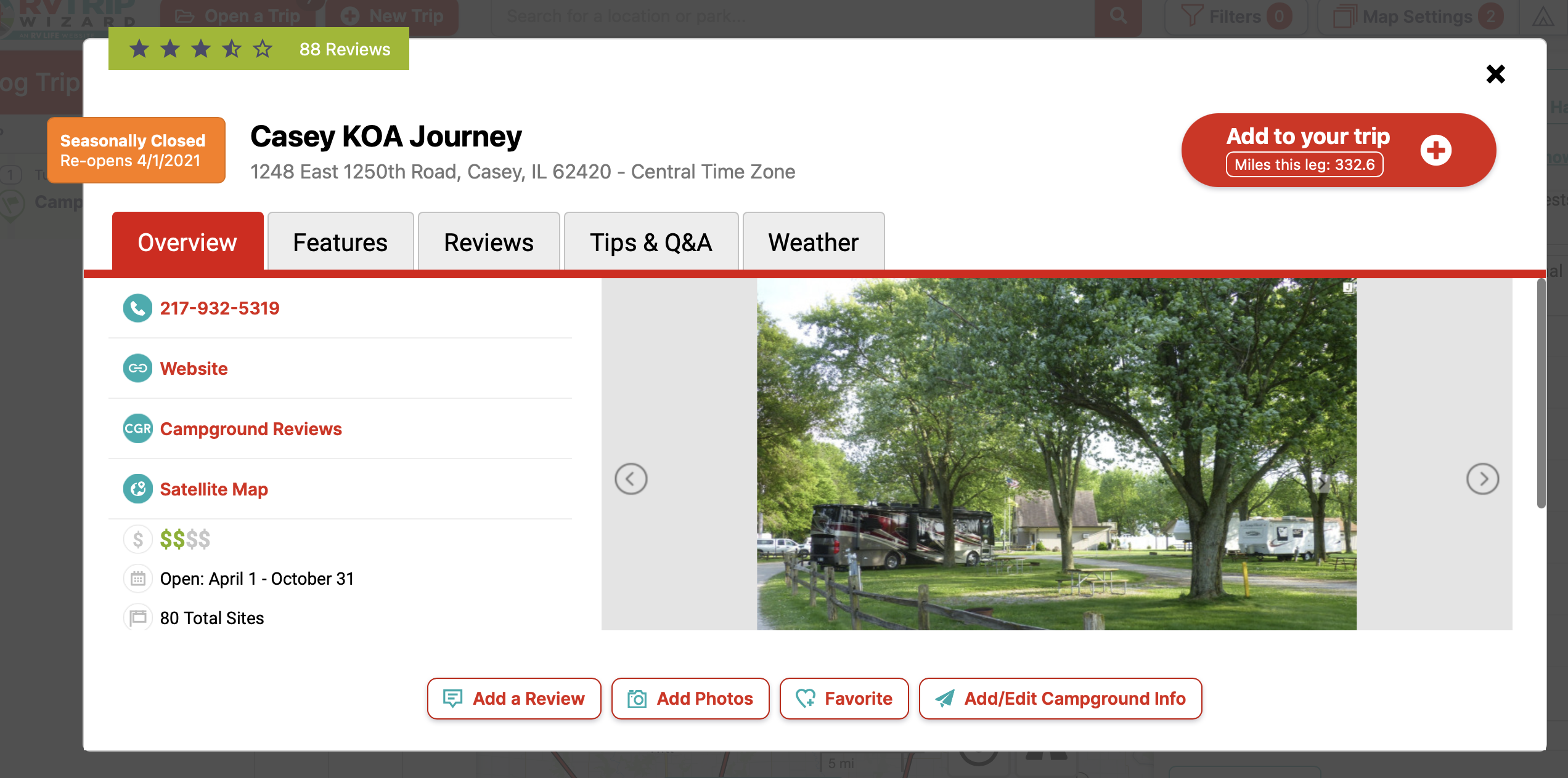 If I select Park Details, I will find reviews, a link to their website, and a lot of additional information. I always take note of the Star Rating and read through the reviews. I can also see this campground is 332.6 miles from my starting location, Campers Grove. Everything I could ask for while planning my trip.