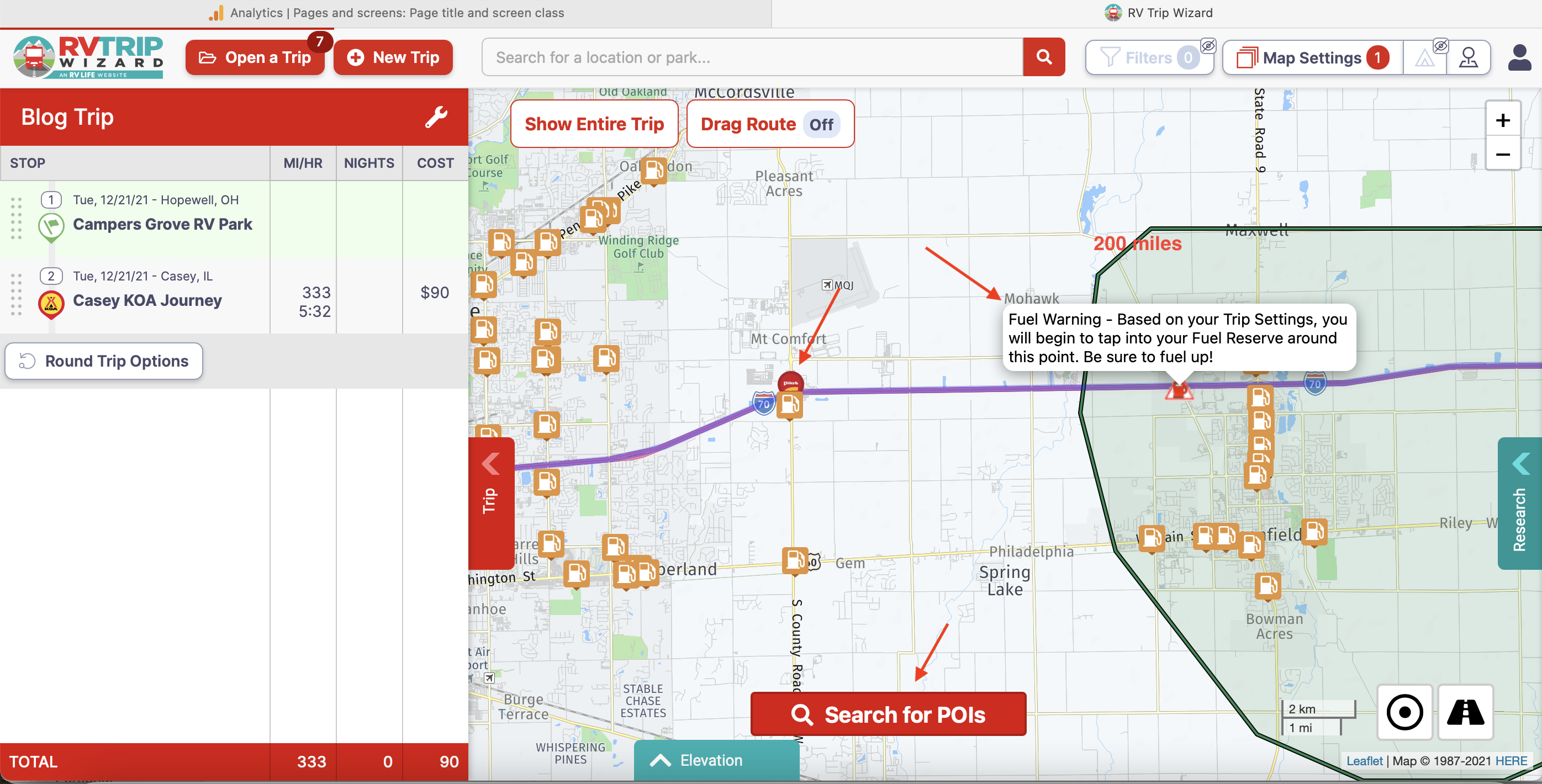 With Casey KOA added, the next thing I need to plan on is a fuel stop. If I click on my starting point under STOP and zoom out, I can see my entire trip. But this time I see a fuel pump icon (warning marker/low fuel indicator) on the map. This marker location is based on the data I entered under RV Information. If you recall, I provided my tank size as 26 gallons, Fuel economy as 10 mpg, and a reserve of 6 gallons. Based on this, the fuel pump icon should be about 200 miles from my starting point. As you can see from the Green Advanced Radius, which is set for 200 miles, the warning marker (low fuel indicator) is right where it should be. Perfect!