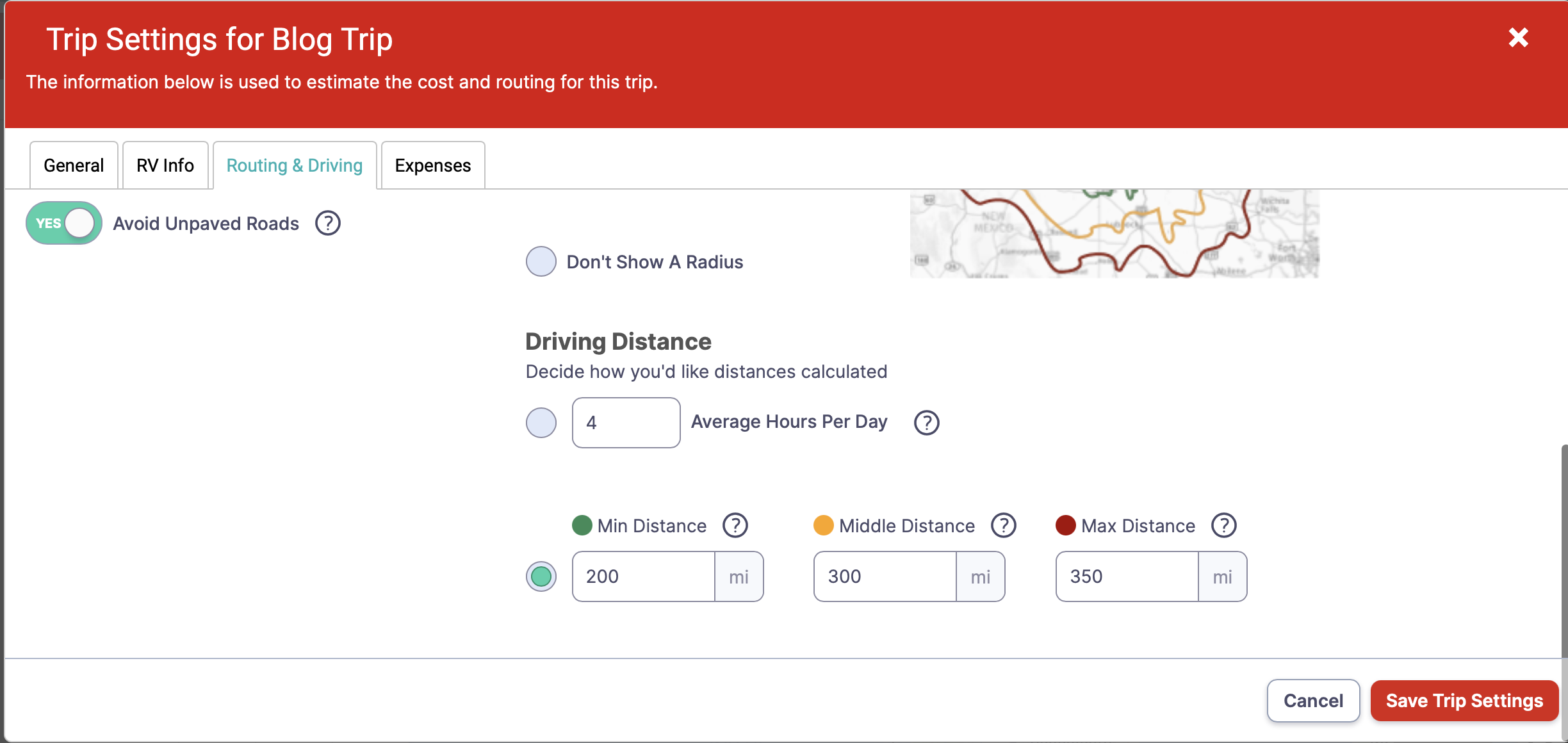 You have an option to choose a single Radius by clicking Average Hours Per Day and entering a value. As you can see I have a value of 4, but I prefer the three distances, which will provide three radiuses. By selecting the three distances, I will be able to see, on the map, where I will end up each day and estimate how long it will take me to travel those distances. Given my average speed of 65 mph, I figure my driving time to be 4.5 to 5.38 hours to complete 300-350 miles, the most I prefer to drive on a given day. In reality, 5.38 hours turns out to be about six-plus hours as towing an RV just takes more time. I can adjust the values later and “fine-tune” them based on my driving experience over time. This will all make sense once I show the map in later steps.