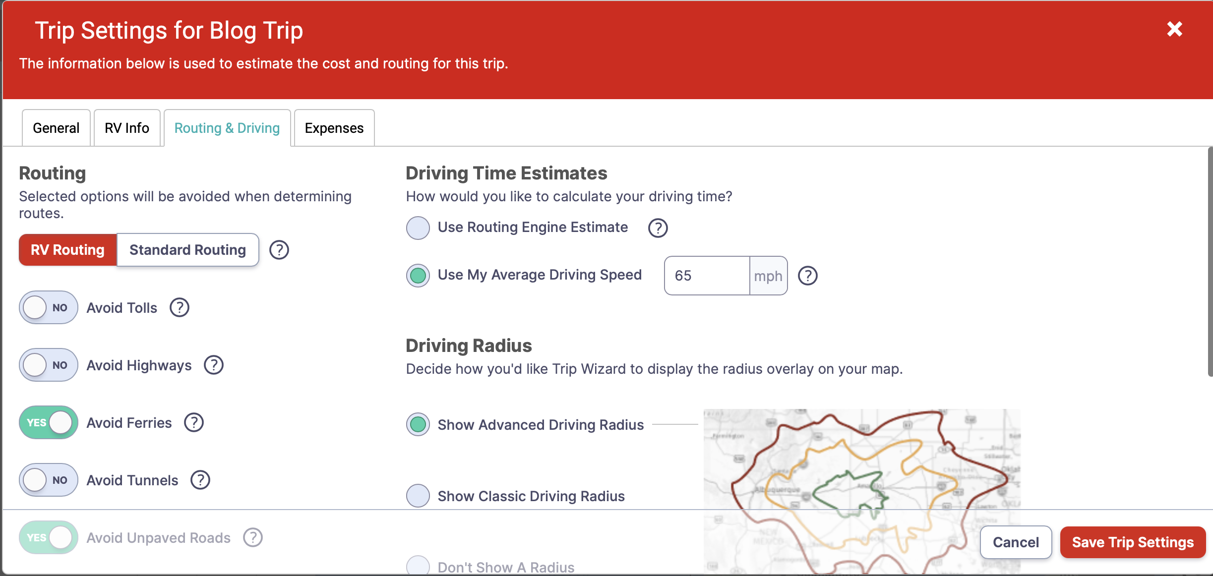 The next tab is Routing & Driving. Complete the information to make use of additional features within this software. The data I entered here is the most important data for travel planning. I click Use My Average Driving Speed and enter 65 mph to estimate my Driving Time. For Driving Radius, you have several options. I prefer Show Advanced Driving Radius.