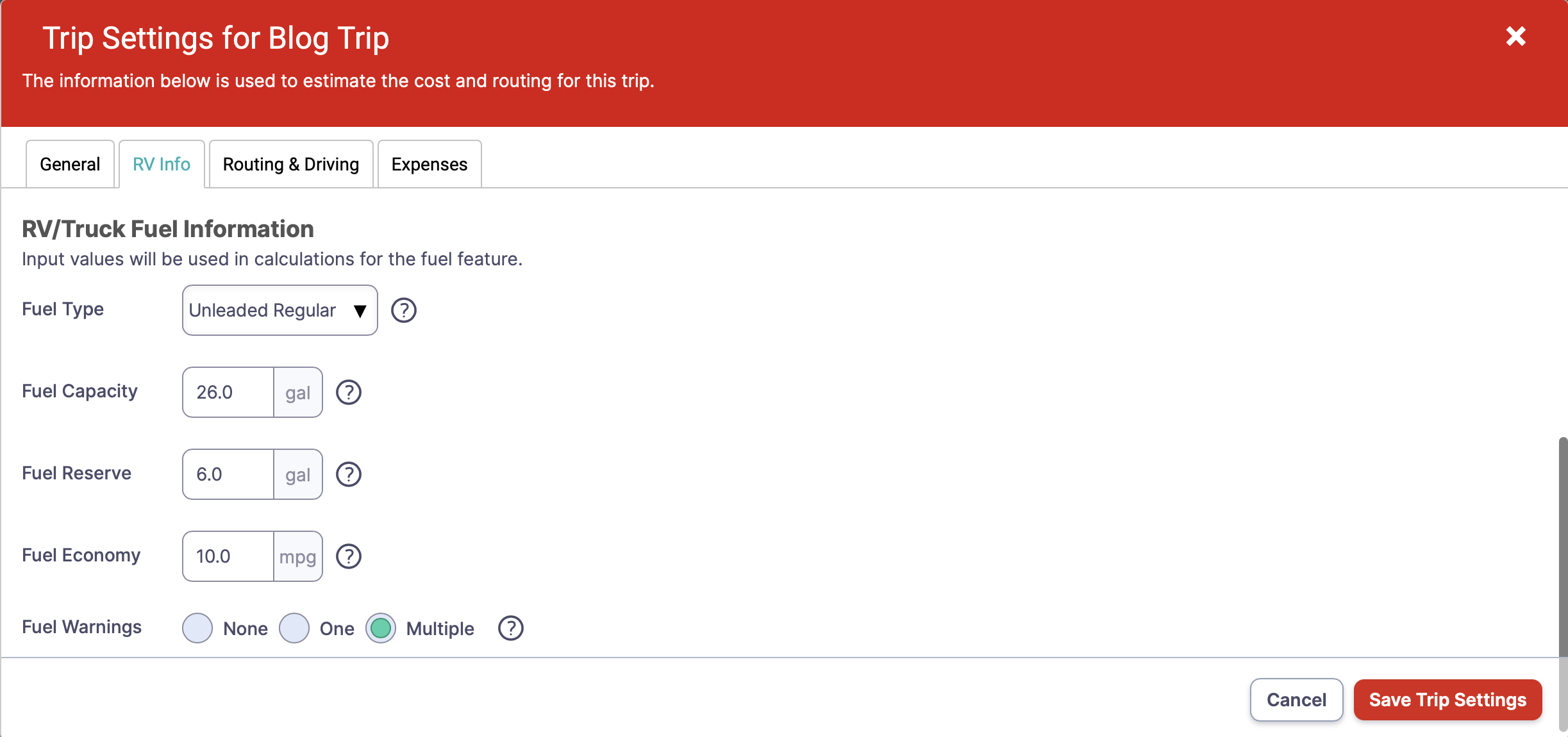 Scrolling down this page, I enter my Fuel information, which is necessary if you wish to use the Low Fuel Indicator feature. This feature will display a Low Fuel Indicator on the map once you reach your fuel reserve. As you can see, I enter Fuel Reserve as 6 gallons. The software will calculate the location of the Low Fuel Indicator based on your Fuel Capacity and miles driven along your route. In my case, I will see a “gas pump” every 200 miles (10 mpg x 20 gallons of fuel used), assuming I stop and fill up every 200 miles. More on this later.
