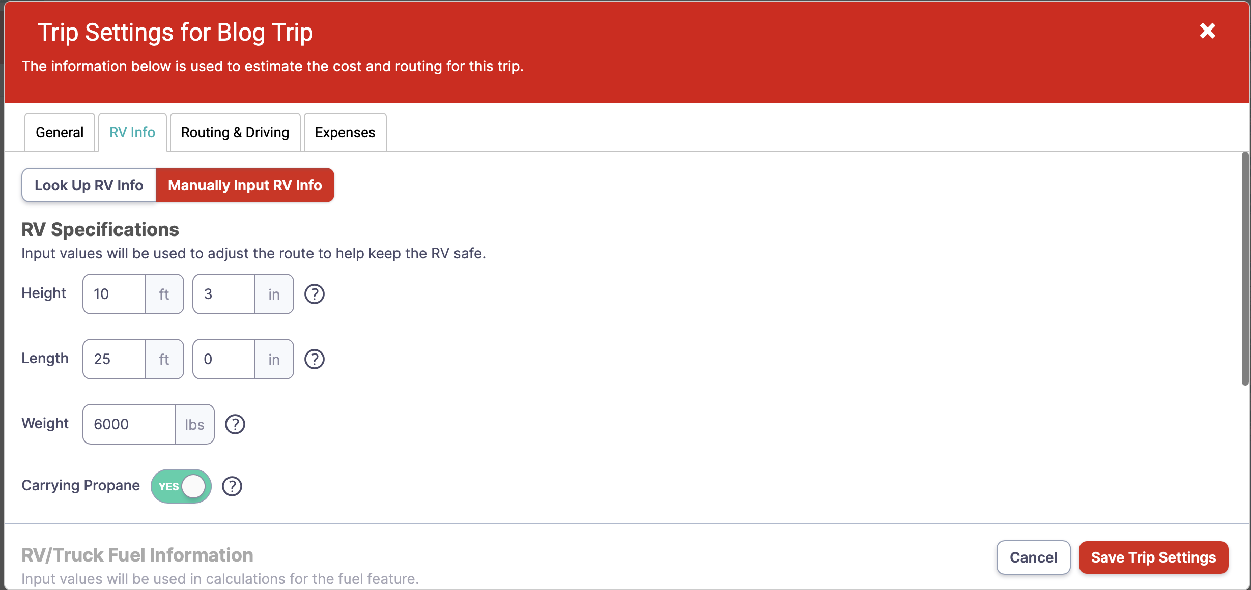 I have a 2020 Coachmen Freedom Express, Model 204RD. On the Trip Settings Page under RV Info, I enter my Height, Length, Weight, and other relevant information.