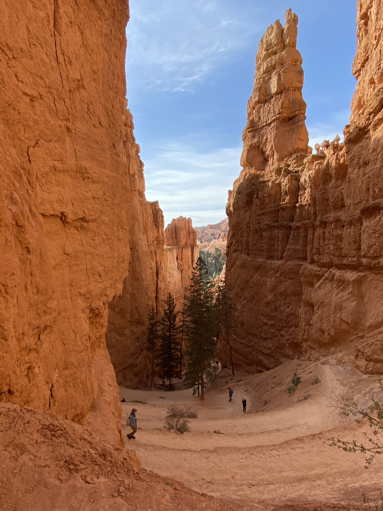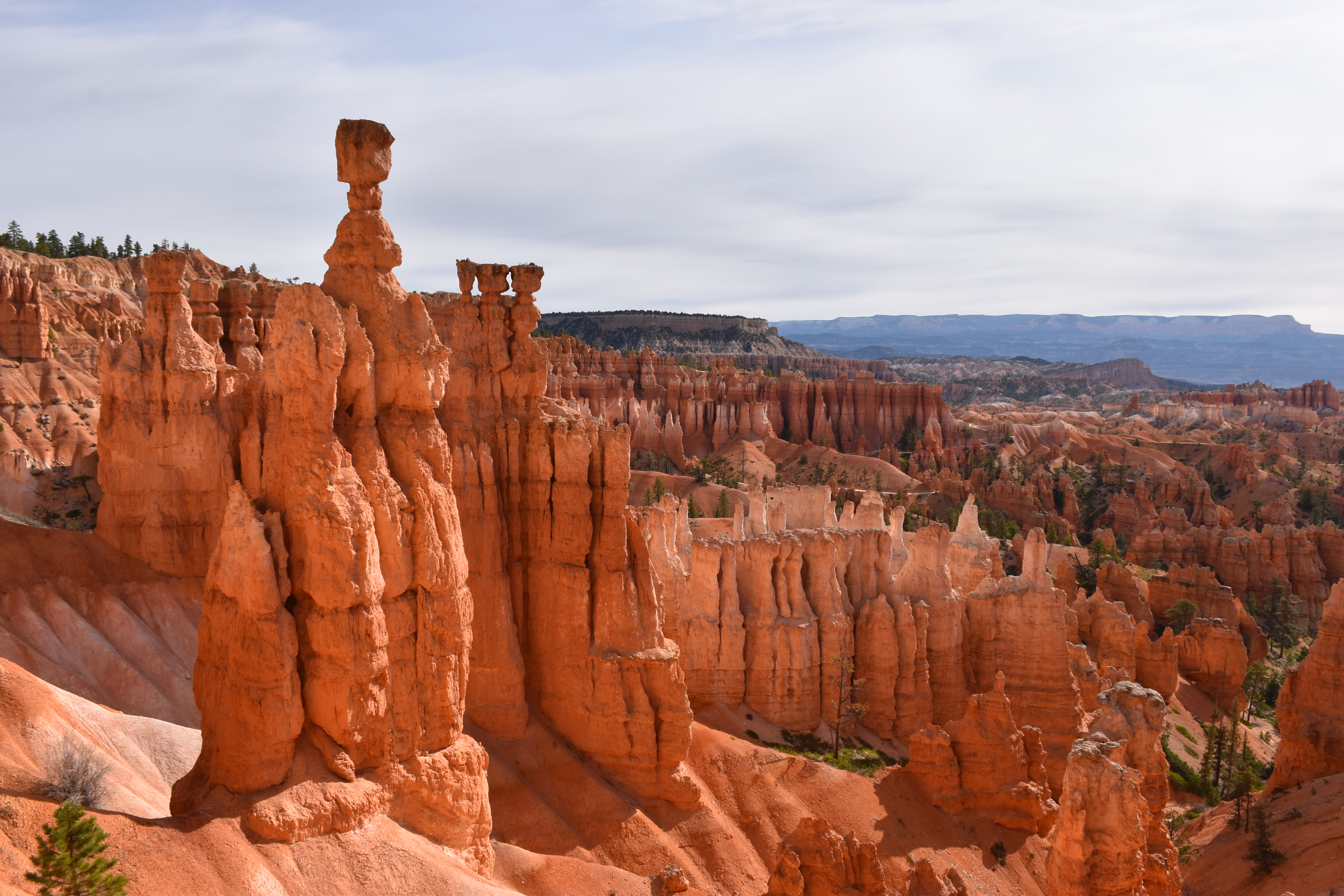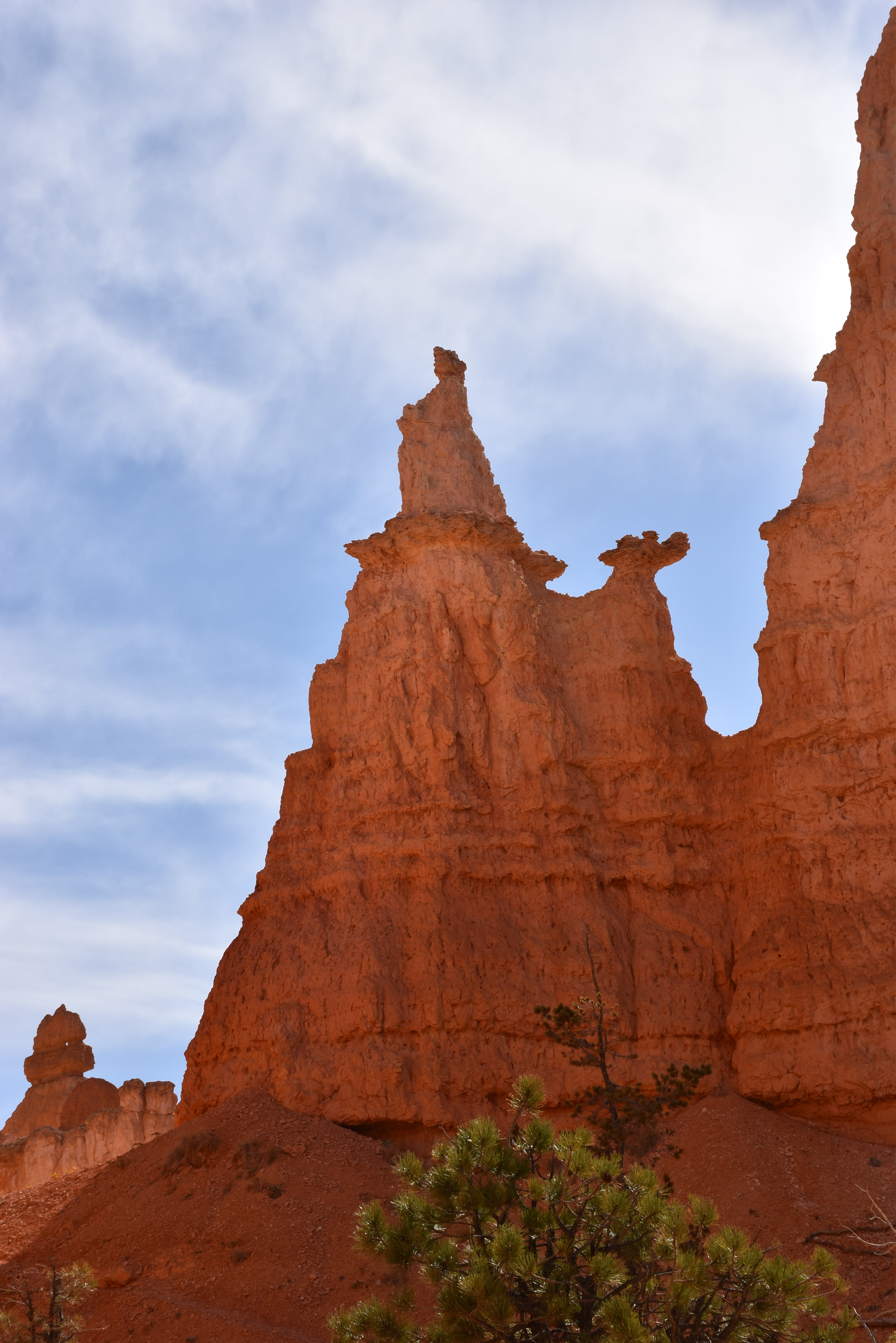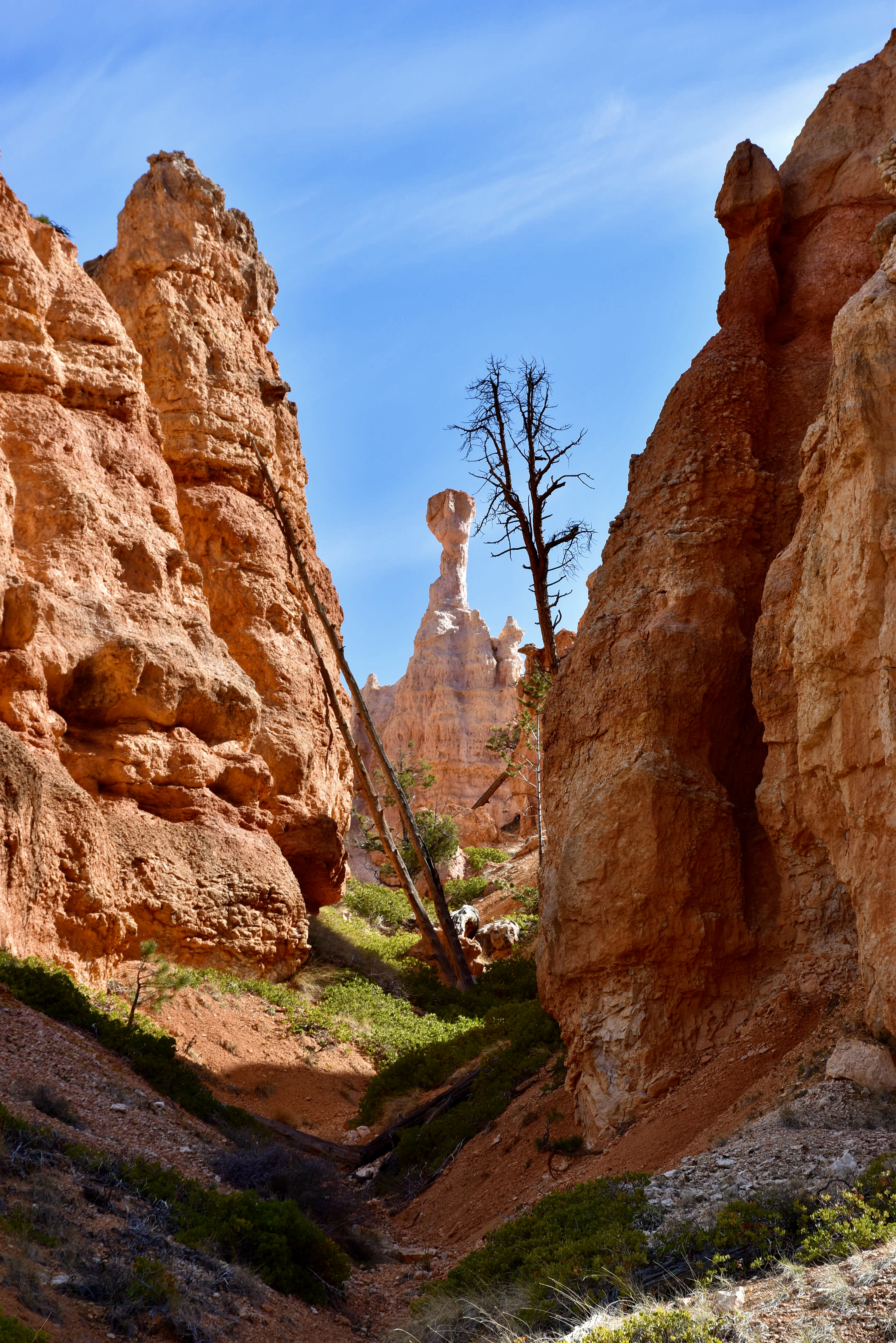 Garden Trail and head up and out of the canyon to Sunrise Point. This is a 2.3-mile hike that drops 521 feet into the canyon and then climbs 320 feet out, thus the suggestion of starting at Sunset Point. We hiked this in May, and even though the Navajo Trail was closed, there was an alternative route that takes you past Two Bridges. This hike provides great views of Thor’s Hammer, Queen Victoria, and hoodoos the entire way. As you hike through the canyon, you pick up the scents of Douglas firs in the canyon. Steller’s Jays will be hanging out in nearby trees waiting for you to drop your snack when you take a break. I highly recommend this trial. It will not disappoint!