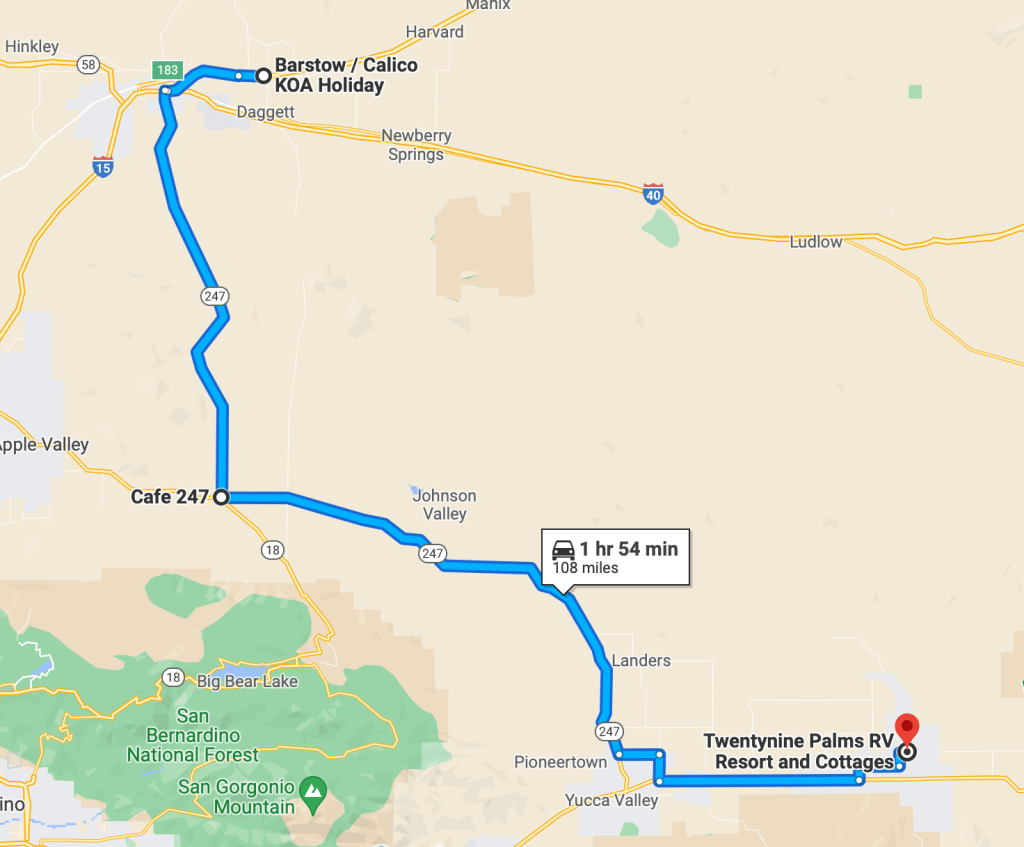 After a good night’s rest, it was time to make our way to Twentynine Palms RV Resort outside of Joshua Tree National Park. Like the travel day before, we faced a wind advisory, 20-30 mph winds with gusts from 40-50 mph. As we headed west on interstate 15 the winds were very strong, and I was dreading the drive. Thankfully this changed after traveling about 30 miles south on 247. In Lucerne, CA, at the intersection where Cafe 247 sits, we made a left turn and started heading southeast. We were no longer traveling into the wind, and the driving improved.