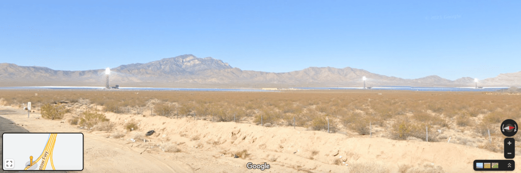 As you drive past Primm, NV, and into California, a strange site emerges in the distance. You begin to wonder if you are still on planet earth or have you entered some foreign space odyssey. In the distance, you can see three large towers with this bright reflection at the top of each. Was this the location of the Coachella Festival? As you get closer, you notice what appears to be solar panels circling the base of each tower. This is California, unusual sites should not be a surprise. As it turns out, the site is the Ivanpah Solar Electric Generating System. 300,000 software-controlled mirrors reflect sunlight to the top of the three 459-foot towers. The concentrated light strikes boiler pipes creating superheated steam which is piped to a turbine to generate electricity. This complex generates enough electricity to power more than 140,000 homes. Mystery solved! A very unusual sight along Interstate 15 in the Mojave desert of California.