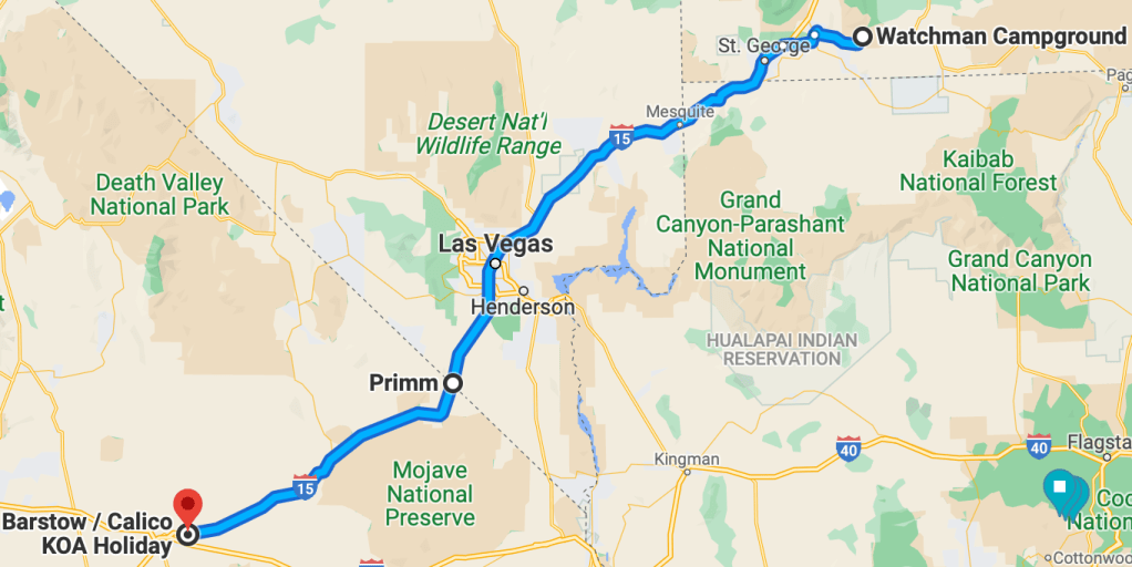 After three nights at the Watchman Campground in Zion National Park it was time to depart and make our way to Twentynine Palms, California. We would use this location to visit Joshua Tree National Park over two days. To break up the trip we would stay overnight at the KOA in Barstow, CA, a 5.5-hour drive from Springdale, UT.