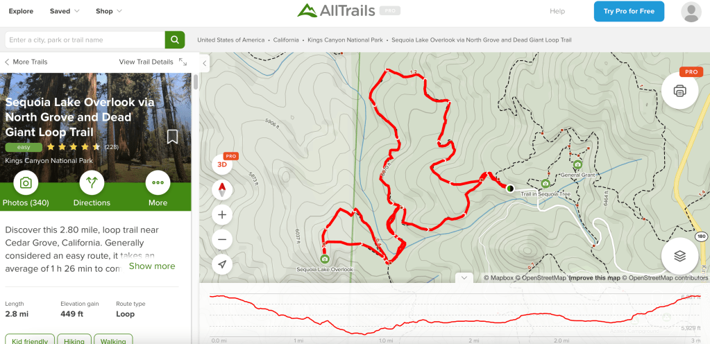 Our final hike would be the North Grove Loop Trail. The parking lot in the General Grant Grove area is very obvious. See the picture below for parking and trailhead.