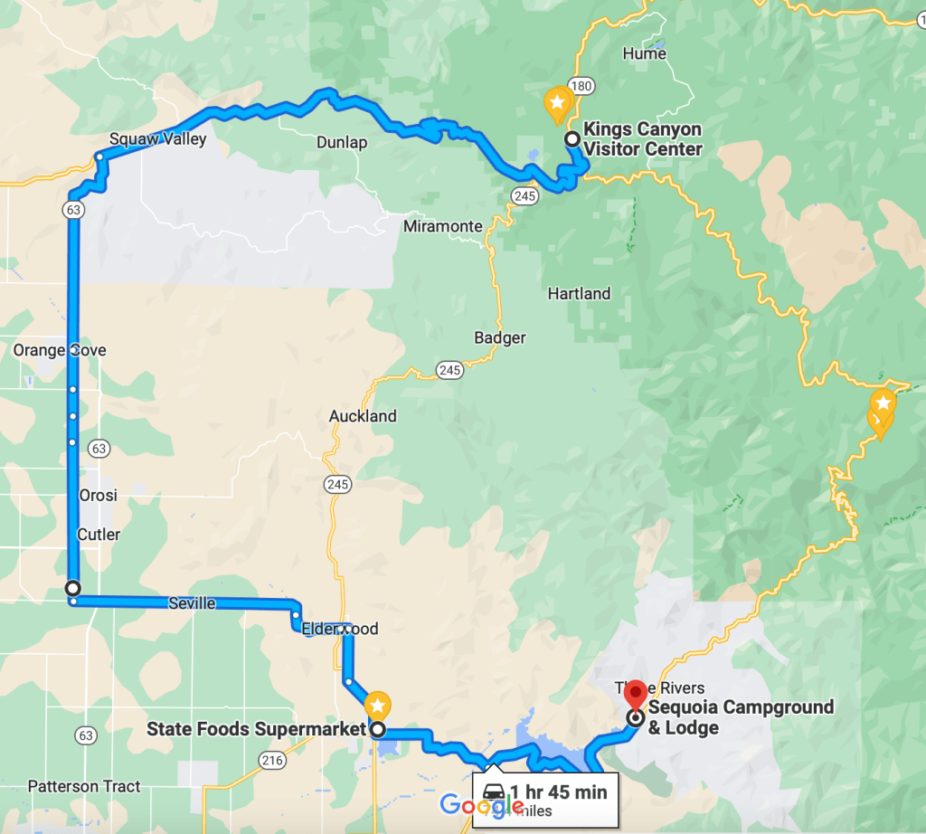 We would opt to exit via CA 180 on our second day in Sequoia National Park, as we had already driven to Kings Canyon, the northern section of this dual national park. On this route, we passed the Sequoia RV Park in Squaw Valley. I took note of the campground as this might be a better option should we return for another visit.