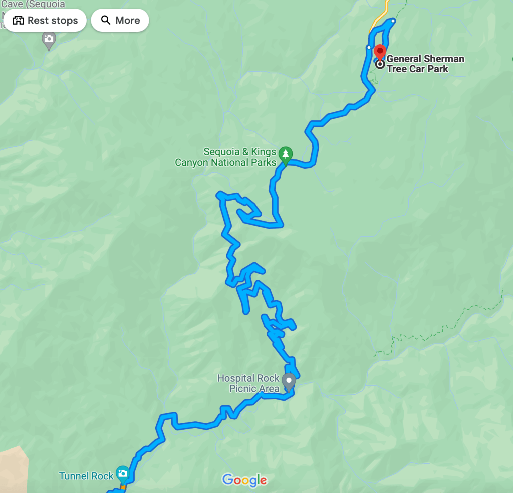 If you plan to visit Sequoia National Park, consider the desired entrance. There are two options, CA 198 through Three Rivers, where we stayed, or CA 180 via Squaw Valley. The drive time on CA 180 from the Big Stump Entrance to General Shermans Tree parking is about 30 miles and will take an hour. The advantage of this drive is you will not have to deal with the twists and turns and steep drop-offs provided on CA 198. Your nerves will thank you.