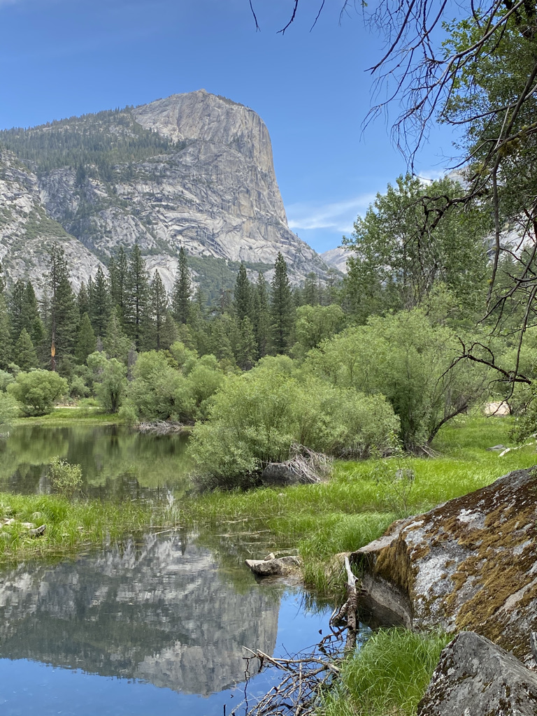 - Mirror Lake, 3.1-miles out and back: As there was no shuttle service, we had to hike from the Vernal Falls Trailhead. At this point, I wished we had bikes. There is a point where bikes are not allowed on the road to Mirror Lake, see this hyperlink for the location. From that point forward, there is a slight climb before reaching the lake. We hiked to Mirror Lake but chose not to hike the Mirror Lake Loop trail. If you wish to hike this 4.4-mile loop, I would suggest downloading a map from Alltrails to stay on trail. The views at Mirror Lake did not disappoint.