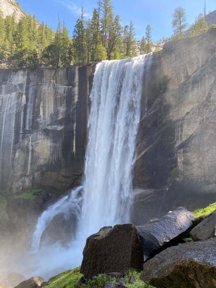 - Mist Trail to Vernal Falls, 1.5-miles one way: You will get wet as the mist from the falls blankets you as you ascend. As you approach the falls, there are many rock steps leading to the top of the waterfalls. It is a steep climb and the rocks can be slippery, so wear good hiking shoes. It was early June and the flow over the waterfall was impressive.